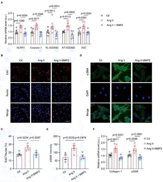 Previous work has shown that BMP2 inhibits NLRP3 inflammasome activation during the development of type 2 diabetes mellitus-induced cardiomyocyte injury [30]. To evaluate whether BMP2 exerts a negative role for the NLRP3 inflammasome pathway in Ang II-treated atrial fibroblasts, we measured mRNA levels of NLRP3 signaling in control, Ang II, and Ang II + BMP2 neonatal rat atrial fibroblasts. qRT-PCR results showed increased mRNA levels of NLRP3, Caspase1, FL-GSDMD, NT-GSDMD, and ASC in Ang II-treated atrial fibroblasts (Figure 5A). Moreover, the mRNA levels of NLRP3, Caspase1, FL-GSDMD, NT-GSDMD, and ASC were mitigated by BMP2 (Figure 5A). Then, we performed an EdU assay to observe the proliferation of different groups of atrial fibroblasts. The data indicated that BMP2 diminished the Ang II-induced ratio of EdU+ atrial fibroblasts (Figure 5B,C). In addition, αSMA staining was used to detect rat atrial fibroblast differentiation. As shown, Ang II significantly increased αSMA signal of atrial fibroblast, which was reversed by BMP2 treatment (Figure 5D,E). The mRNA levels of Collagen 1 and αSMA in Ang II-treated atrial fibroblasts increased compared to Ctl group, which were downregulated by BMP2 (Figure 5F). These results establish that BMP2 decreases the activated NLRP3 inflammasome and profibrogenic phenotype in Ang II-treated rat atrial fibroblasts.