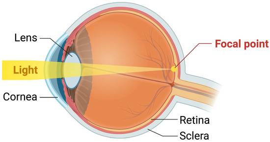Optics in ophthalmology: image refraction. As light passes through the structures of the human eye (cornea, lens, vitreous humor), it is refracted until it reaches the focal point situated at the back of the posterior segment. Each anatomical structure within the eye possesses a refractive index, which is a measure of the bending of a ray. Structural alterations to these structures cause a change in their respective refractive index, therefore leading to vision impairment. The Figure was created with BioRender.com (https://www.biorender.com, accessed on 03 July 2024).