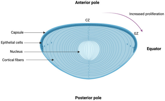 Schematic illustration of the human eye lens. The human eye lens is composed of four main structures: the capsule, epithelial cells the nucleus, and the cortical fibers. As the epithelial cells migrate from the anterior pole to the posterior pole, they acquire greater proliferative capacity; in the central zone (CZ), there is an absence of mitosis in epithelial cells whereas, in the germinal zone (GZ), the epithelial cells exhibit maximal mitosis and cell proliferation. Alterations in the proliferation and migration of epithelial cells form the backbone of cataracto-genesis. The Figure was created with BioRender.com (https://www.biorender.com, accessed on 05 July 2024.