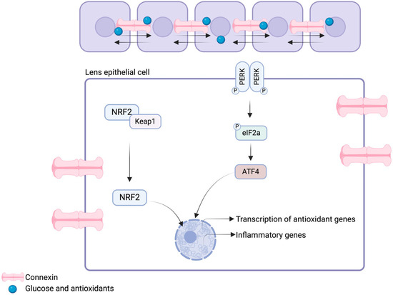 Schematic representation of antioxidant mechanisms in the human lens epithelium. Antioxidants and glucose are delivered to lens epithelium cells through the gap junctions known as connexins. Upon oxidative stress in the human eye lens, NRF2 and ATF4 are activated to induce the transcription of antioxidant and inflammatory genes. The figure was created with BioRender.com (https://www.biorender.com, accessed on 10 July 2024).