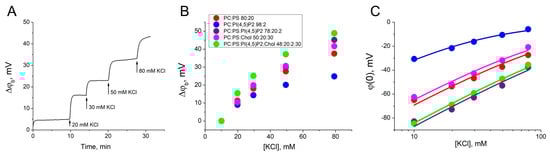 - Sokolov, V.S.; Kuz’min, V.G. Measurement of differences in the surface potentials of bilayer membranes according to the second harmonic of a capacitance current. Biofizika 1980, 25, 170–172. [Google Scholar]