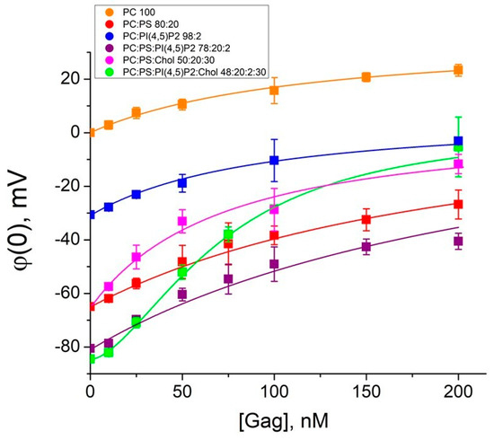 - Socas, L.B.P.; Ambroggio, E.E. HIV-1 Gag Specificity for PIP2 Is Regulated by Macromolecular Electric Properties of Both Protein and Membrane Local Environments. Biochim. Biophys. Acta Biomembr. 2023, 1865, 184157. [Google Scholar] [CrossRef] [PubMed]