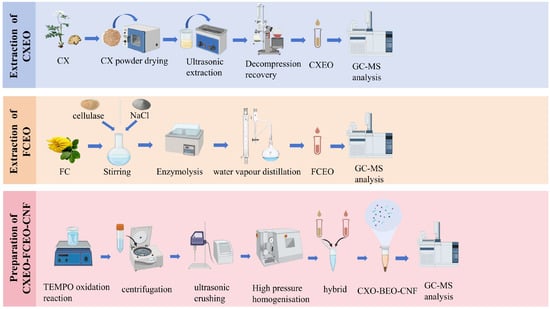 The nanofiber suspension was created through the process of chemical oxidation and high-pressure homogenization [20]. A solution of 0.5 M sodium hydroxide was produced beforehand for adjusting the pH. A quantity of 1 g of microcrystalline cellulose was measured and mixed with 100 mL of ultrapure water at room temperature for 10 min. Then, 0.04 g of 2,2,6,6-tetramethylpiperidine-1-oxyl radical (TEMPO) and 0.64 g of NaBr were added to the cellulose suspension. Following the complete dissolution of TEMPO, sodium hypochlorite was incrementally added to commence the oxidation process. The pH of the control system was modified to a range of 10 to 11 by adding a 0.5 mol/L NaOH solution during the procedure. The oxidation of TEMPO was synergized using ultrasound as the method of processing. The system was thereafter positioned on a magnetic stirrer, and the reaction was permitted to undergo continuous stirring for a duration of 26 h at a temperature of 25 degrees Celsius and a speed of 300 revolutions per minute. Ultimately, the process was halted by adding 3 mL of anhydrous ethanol. CNF gel was obtained using centrifugation at 8000 revolutions per minute for 10 min. It was then mixed with 10 milliliters (mL) of water and subsequently subjected to dialysis using a dialysis bag with a molecular cut-off of 6000–8000. The dialysis process lasted for 3 days, during which no precipitation was observed. The lack of chloride ions was confirmed by testing with silver nitrate. A 10 mL suspension of CNF was subjected to sonication for 10 min using a cell crusher operating at a temperature of 10 °C and a power of 450 W at 70% intensity. The clear nanofibrillar solution, obtained after sonication, underwent high-pressure homogenization at a temperature of 4 °C for 30 min. The homogenization process involved applying a pressure of 1800 Bar for 30 cycles. Throughout the homogenization process, the temperature was maintained at 4 °C by circulating cooling water. The result was a stable, transparent, and uniform nanofibrillar suspension. This suspension was then stored at 4 °C for future use. The loading technique of essential oils is a reference to the preceding procedure [21,22]. The nanofiber suspension was continuously stirred for 24 h to achieve a homogeneous distribution. CXEO and FCEO were then added to the suspension in a 1:1 ratio, aided by a certain amount of Tween-80 to enhance solubility. The mixture was further sonicated using an ultrasonic machine in an ice bath for 5 min to obtain the composite essential oil nanofiber system. The preparation of CXEO-FCEO-CNF is shown in Figure 1.