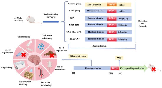 Figure 2 demonstrates the random division of all male ICR mice into six groups, each consisting of 10 mice (n = 10). The groups included in the study were the control group, model group, DZP group (administered at a dose of 3 mg/kg, Diazepam), CXEO-FCEO group (pure essential oil group), CXEO-FCEO-CNF group (essential oil nanofiber group), and CNF group (blank nanofiber group). This work utilized the chronic unpredictable mild stress (CUMS) approach paired with the intraperitoneal injection of PCPA to create an insomnia mouse model that accurately simulates the effects of excessive mental stress in humans [9,23]. In order to ensure the unpredictability of the stressors, the mice were subjected to chronic stressors in a random manner, with the exception of the control group. The stressors consisted of tail spasms lasting for 1 min, swimming in cold water at a temperature of 4 °C for 5 min, being deprived of food for 24 h, being deprived of water for 24 h, experiencing a reversal of the circadian rhythm for 24 h, being exposed to wet woodchip pads for 24 h, being subjected to cage tilting at a temperature of 45 °C for 24 h, and being restrained in the limbs for 24 h. The mice were subjected to one stressor per day for a total of 28 days, ensuring that the same stressor was not repeated on consecutive days. The mice were administered an intraperitoneal injection of a suspension of PCPA (30 mg/mL) at a dosage of 300 mg/kg at 13:00 on days 29–30. The model exhibited physiological traits of irritation and heightened voluntary activity following effective modeling [24]. During the modeling process, both the control group and the model group of mice were given the same amount of saline (1 mL/100 g) through oral administration. The remaining mice were given the corresponding medication through inhalation in an aromatherapy room once a day for 28 consecutive days. Subsequently, blood was extracted via the orbital cavity. Following the execution of the mice, their brain tissues were gathered and preserved in a refrigerator at a temperature of −80 °C.