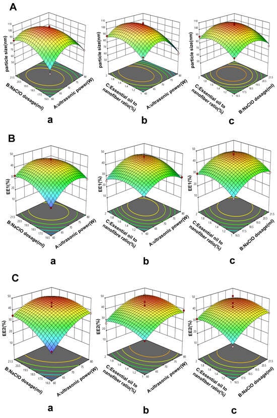 Three-dimensional response surface diagrams. (A) Response surface diagrams of particle size. (B) Response surface diagrams of EE1. (C) Response surface diagrams of EE2. (a) NaClO dosage to ultrasonic power. (b) Essential-oil-to-nanofiber ratio to ultrasonic power. (c) Essential-oil-to-nanofiber ratio to NaClO dosage. The gradual change from the green region part to the red region part means that the particle size and encapsulation efficiency gradually increases, and the fixed point in the red region is the maximum particle size and encapsulation efficiency in the experimental simulation.