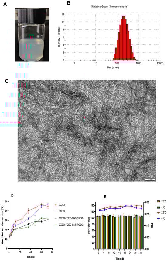 Characterization of CXEO-FCEO-CNF. (A) Appearance of CXEO-FCEO-CNF. (B) Size distribution of CXEO-FCEO-CNF. (C) TEM photograph of CXEO-FCEO-CNF. (D) In vitro release plots of CXEO, FCEO, and CXEO-FCEO-CNF. (E) Graph of the results of the stability examination of CXEO-FCEO-CNF.