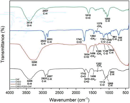 The morphology of CXEO-FCEO-CNF was assessed using transmission electron microscopy (TEM) with a JEOL JEM-1400FLASH TEM instrument manufactured by Shimadzu in Japan. The samples were treated with a 1% (w/v) solution of phosphotungstic acid (pH = 7.0) for 1–2 min at room temperature. After drying, they were imaged using TEM. Furthermore, the nanoparticle size meter (Anton Paar, Litesizer 500, Graz, Steiermark, Austria) was utilized to assess the average particle size, particle size distribution, and polydispersity index (PDI) of CXEO-FCEO-CNF. The infrared spectral analysis of CXEO, FCEO, CXEO-FCEO-CNF, and CNF was conducted using a Nicolet 6700 Fourier transform infrared spectroscopy (FT-IR) spectrometer instrument. Approximately 2 mg of each sample (CXEO, FCEO, CXEO-FCEO-CNF, and CNF) and 100 mg of potassium bromide were homogeneously ground together. The resulting mixture was then pressurized to 20 MPa for tabletting. The samples were subsequently analyzed for infrared testing.