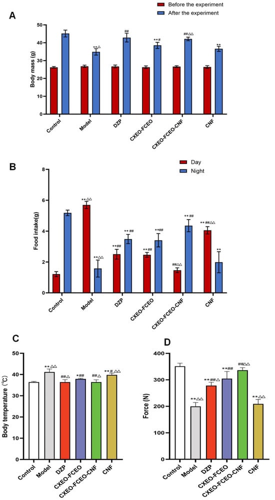 Comparison of body weight, food intake, body temperature, and grip strength of mice in each group. (A) Changes in the body weight of mice in each group before and after the experiment. (B) Changes in the daytime and nighttime food intake of mice in each group. (C) Changes in the body temperature of mice in each group. (D) Changes in the grip strength of mice in each group. Data are expressed as the mean ± SD. * refers to a significant difference when compared with the control group, * indicates p < 0.05, ** indicates p < 0.01, # refers to a significant difference when compared with the model group, # indicates p < 0.05, ## indicates p < 0.01, Δ refers to a significant difference when compared with the CXEO-FCEO group, Δ indicates p < 0.05, and ΔΔ indicates p < 0.01.