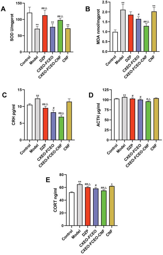 Oxidative stress index test and serum biochemical index test. (A) SOD activity. (B) MDA level. (C) CRH level. (D) ACTH level. (E) CORT level. Data were expressed as the mean ± SD. * refers to a significant difference when compared with the control group, * indicates p < 0.05, ** indicates p < 0.01, # refers to a significant difference when compared with the model group, # indicates p < 0.05, ## indicates p < 0.01, Δ refers to a significant difference when compared with the CXEO-FCEO group, Δ indicates p < 0.05.