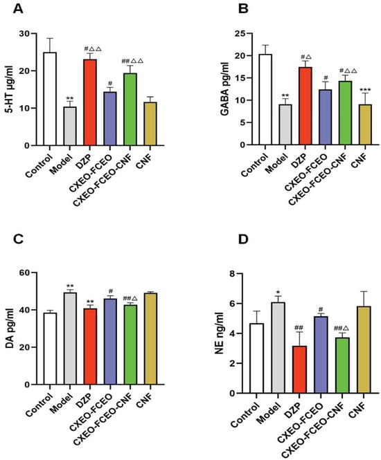 Neurotransmitter content assay. (A) 5-HT levels. (B) GABA levels. (C) DA level. (D) NE levels. Data are expressed as the mean ± SD. * refers to a significant difference when compared with the control group, * indicates p < 0.05, ** indicates p < 0.01, *** indicates p < 0.001, # refers to a significant difference when compared with the model group, # indicates p < 0.05, ## indicates p < 0.01, Δ refers to a significant difference when compared with the CXEO-FCEO group, Δ indicates p < 0.05, and ΔΔ indicates p < 0.01.