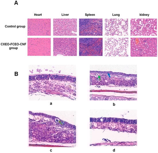 Safety evaluation. (A) Tissue safety evaluation after drug inhalation via the nose (×400). (B) HE staining images of the nasal mucosa of mice in each group (×400). (a) Saline group; (b) Sodium deoxycholate group; (c) CXEO-FCEO solution group; (d) CXEO-FCEO-CNF group. Green arrows represent inflammatory cell infiltration and blue arrows indicate epithelial cell proliferation.