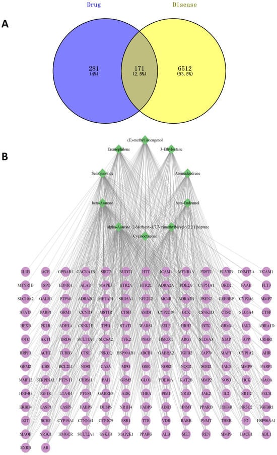 (A) Venn diagram of intersecting targets. (B) Network diagram of drug component targets.