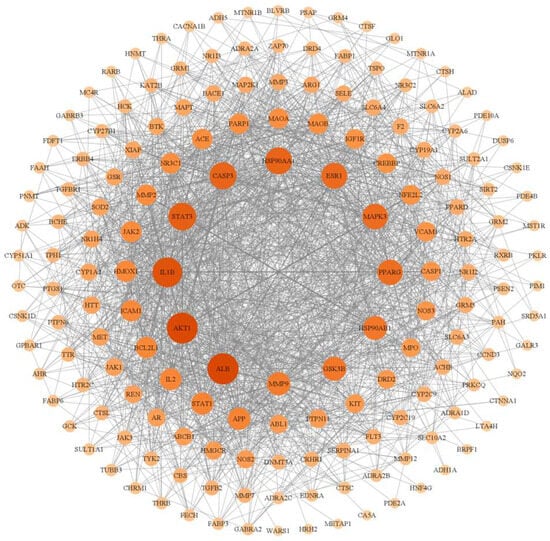 From the database, we obtained 281 targets corresponding to the ten components of CXEO-FCEO and the 6512 disease targets of insomnia, mapped the component targets with insomnia targets, obtained 171 potential targets for the treatment of insomnia, and used Venny 2.1.0 to draw a Venn diagram to show the results; see Figure 12A. The component-intersection target network diagram is shown in Figure 12B. There were 181 nodes, 10 active ingredients, and 171 target nodes with 680 edges, and the results showed that the first 7 active ingredients with degree values greater than the average (degree value ≥ 4) were mainly alpha-Asarone, (E)-methyl isoeugenol, and so on. Protein interaction analysis of the intersecting targets was carried out using the String database, and Cytoscape 3.9.1 was used to construct the PPI network, as shown in Figure 13. The data related to the network graph were obtained by topology analysis, which showed that there were 65 targets with the degree of freedom, tightness, and centrality of each node of the network exceeding the average value. Taking the node degree value as an evaluation parameter, the larger the node degree value, the more important it is in the PPI network, and it may play an important role in performing biological functions. According to the analysis of the degree of freedom and center tightness, the core targets were obtained as IL-1β, STAT3, MAPK3, etc., among which IL-1β and STAT3 were closely related to the inflammatory response.