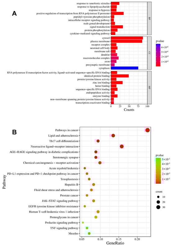 Enrichment analysis. (A) GO enrichment analysis. (B) KEGG pathway analysis.