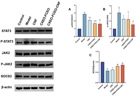 Graph of WB results. (A) Expression of P-STAT3 and STAT3. (B) Expression of P-JAK2 and JAK2. (C) Expression of SOCS3. Data were expressed as the mean ± SD. * refers to a significant difference when compared with the control group, ** indicates p < 0.01; # refers to a significant difference when compared with the model group, # indicates p < 0.05, ## indicates p < 0.01 (for the original Western Blot Images, see the supplementary materials).