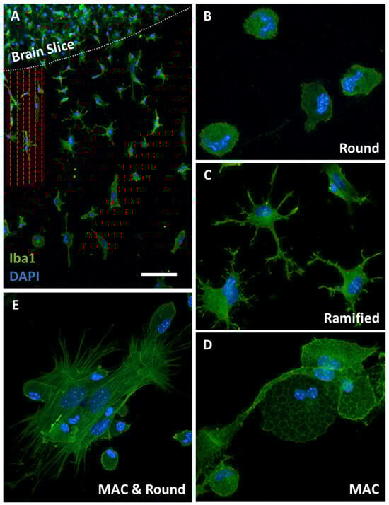 Immunofluorescence staining for Iba1-positive microglia. Microglia were stained by immunofluorescence using Alexa Fluor 488 (green) and counterstained with nuclear DAPI (blue). (A) Brain slice (border indicated with the white dotted line) with several migrated microglia along the microcontact-printed lanes (red dashed lines). (B–D) We identified three types of migrated microglia: small round (B), ramified with many processes (C), and large macrophagic (MAC) microglia (D). (E) Large macrophagic microglia are compared with small round microglia. Scale bar = 250 µm (A) and 50 µm (B–E).