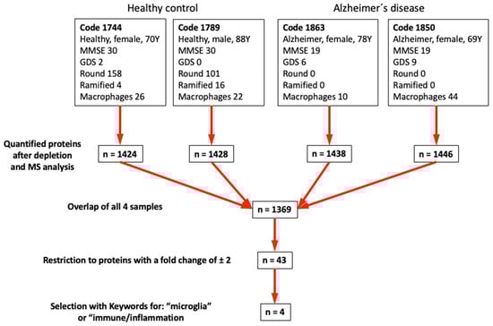 The four best plasma samples were selected (two controls and two Alzheimer’s disease) based on the experiments on activation of round microglia. After depletion of 14 proteins, the number of identified proteins is shown. Differential mass spectrometry and linking to the keywords “microglia” or “immune/inflammation” finally resulted in four identified putative biomarkers.