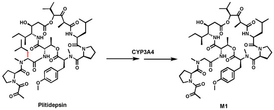 Previous metabolism studies of Plitidepsin in human liver microsomes (HLM) and human P450 isoenzymes indicated that CYP3A4-mediated C-dealkylation occurred leading to M1 (Figure 1) [30]. The exact mechanism of this C–C bond cleavage is not fully understood [30]. C-dealkylation metabolite was also observed in the urine and feces of patients treated with Plitidepsin [56]. More studies are needed to understand the cleavage.