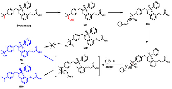 Evatanepag (also known as CP-533,536), an EP2 receptor-selective prostaglandin E2 agonist, shows promise for aiding bone fracture healing [65]. In HLM, two C-demethylation-related metabolites, M9 and M10, were identified (Figure 5) by LC-MS, and their structures were confirmed by NMR. CYP3A4/5 and CYP2C8 were determined as the major enzymes responsible for the C–C bond cleavage using CYP3A4/5 inhibitors (ketoconazole) and a CYP2C8 inhibitor (quercetin).