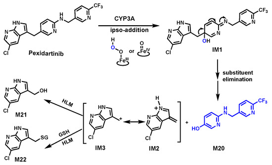 Pexidartinib (PEX) is a kinase inhibitor used to treat tenosynovial giant cell tumors, especially when surgery is not a suitable option [70]. However, cases of serious liver toxicity in some patients raised concerns about its safety [71]. In HLM, four metabolites of PEX (M20, M21, M22, and M23) indicated C–C bond cleavages occurred (Figure 8 and Figure 9). The structures of these metabolites were confirmed based on their exact masses, MS/MS fragmentation patterns, and their standard compounds. CYP3A was determined as a primary enzyme responsible for cleavage using human P450 isozymes and chemical inhibitors (ketoconazole, a CYP3A inhibitor) in HLM [46,72].