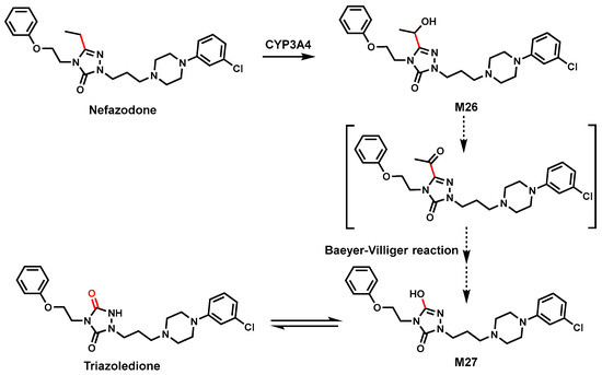 The mechanism was proposed as an initial hydroxylation of the ethyl side chain of Nefazodone to form alcohol M26, which undergoes C–C bond scission to generate intermediate alcohol M27. Possibly, M26 was further oxidized to ketone intermediate, which proceeded to M27 by the Baeyer–Villiger reaction. It is well known that M27 is tautomerized to a ketone, triazoledione in the body [47]. The exact mechanism of this C–C bond cleavage is still unclear.