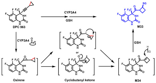 The proposed mechanism of M33 formation involved multiple steps (Figure 12): CYP3A4-mediated oxidation of the triple bond to form the putative oxirene, followed by ring expansion to form a butyl cation via C–C bond cleavage or rearrangement to form the reactive cyclobutenyl ketone [79,80,81]. These active species were converted to an α,β-unsaturated ketone intermediate M34, which reacts with GSH to form the M33 [49]. However, the exact mechanism is still unclear.