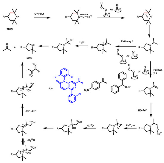 2,2,6,6-Tetramethylpiperidine (TMPi) is a building block with the widespread use of piperidine derivatives in drug development. Researchers discovered an uncommon ring-shrinked metabolite M35, indicating that the TMPi ring undergoes a C–C bond cleavage and ring contraction. NMR spectroscopy experiments confirmed the structure of contracted pyrrolidine ring M35 (Figure 13). Additional experiments with anti-P450 monoclonal antibodies and P450 isoenzymes suggested that the CYP3A4 primarily contributed to this metabolic transformation [51]. The potential mechanism is proposed as a nitroxide radical derived from TMPi interacts with heme iron, leading to homolytic scission of the N-O bond and subsequent C–C bond cleavage, resulting in the contraction of the piperidine ring to M35.