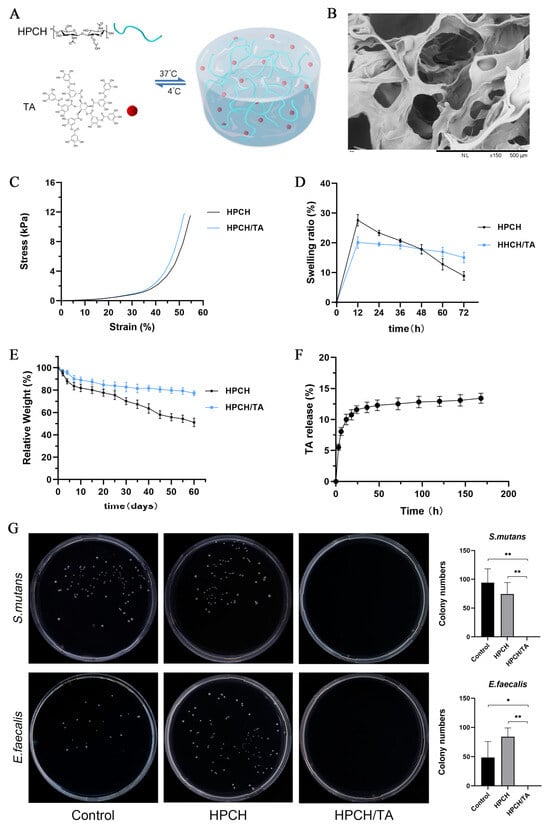 Characterization of the hydrogels. (A) Schematic structure of the HPCH/TA hydrogel. (B) Representative SEM images of HPCH/TA hydrogel. (C) Compressive stress–strain curves of HPCH hydrogel and HPCH/TA hydrogels. (D) Swelling behaviors of the above hydrogels. (E) In vitro degradation behaviors of the above hydrogels. (F) TA release curve of the HPCH/TA hydrogels. (G) No colony growth was observed in the presence of the HPCH/TA hydrogel, compared to the control group (PBS) and the HPCH hydrogel. Colony numbers analysis showed that the difference was significant. * p < 0.05 and ** p < 0.01.