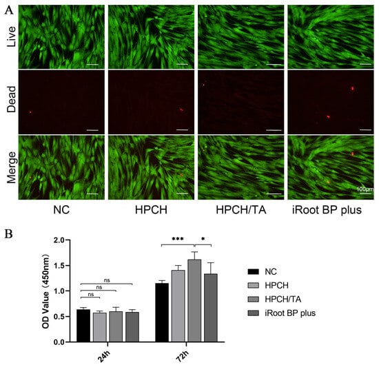 hDPCs were placed onto 96-well culture plates at a density of 5 × 103 cells/well. They were then exposed to extract liquid of various materials: HPCH hydrogel, HPCH/TA hydrogel, and iRoot BP Plus. For each group, three sub-wells were used, and each well was treated with 100 µL of leaching solution for either 24 h or 72 h as per the instructions. Following the exposure, 10 µL of the cell counting kit-8 (CCK-8, Biosharp, Shanghai, China) was added to each well, and the plates were incubated under light protection for one hour. Finally, the absorbance at 450 nm was measured.