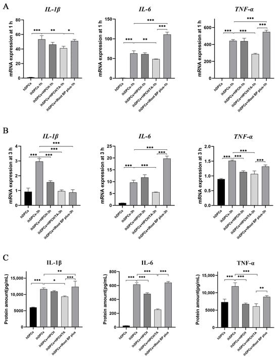 The effects of the hydrogels or iRoot BP Plus on the expression of inflammatory cytokines in ihDPCs. (A) The mRNA expression of the inflammatory cytokines IL-1β, IL-6, and TNF-α was evaluated after one hour of LPS stimulation following treatment with the hydrogels or iRoot BP Plus. (B) The mRNA expression of the above inflammatory cytokines was evaluated after three hours. (C) The protein levels of the inflammatory cytokines were evaluated after 24 h. * p < 0.05, ** p < 0.01, and *** p < 0.001.