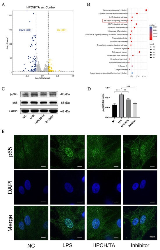 Anti-inflammatory activity of the HPCH/TA hydrogel may occur through inhibition of the NF-κB signaling pathway. (A) Volcano map showing differential genes (yellow plots represent differentially upregulated genes; blue plots are for differentially downregulated genes; gray plots represent the genes with no difference). (B) KEGG pathway enrichment analysis in DEGs. The red box showed a significant enrichment in pathways associated with the NF-κB pathway. (C) Expression of p65 and p-p65 was analyzed by Western blot. (D) The density of bands was analyzed using ImageJ software, and statistical analysis was performed to determine the ratio of p-p65 to total p65. (E) Immunofluorescence imaging of p65 in ihDPCs treated with LPS after three hours. The cells were stained with anti-p65 antibody (appearing in green) and counterstained with DAPI to identify cell nuclei (appearing in blue). ** p < 0.01 and *** p < 0.001.