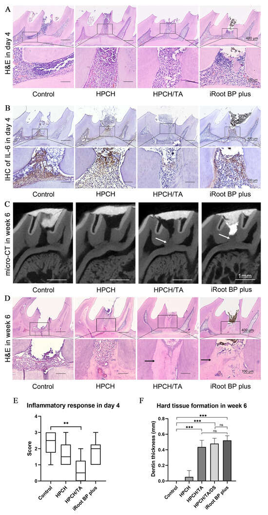 After six weeks of capping, micro-CT imaging (Figure 5C) revealed the absence of hard tissue formation in the control group. In contrast, significant hard tissue formation was observed under the pulp capping material in the iRoot BP Plus group, which served as the positive control. Additionally, complete hard tissue formation was noted in both HPCH/TA groups. Hard tissue formation was observed in the HPCH group, but it was incomplete. The thickness of the hard tissue formation was similar between the HPCH/TA groups and the iRoot BP Plus group (Figure 5F). Representative H&E staining (Figure 5D) showed the absence of reparative dentin formation within the pulp cavity in the control group. Conversely, a complete reparative dentin formation was observed under the pulp capping material in the HPCH/TA and iRoot BP Plus groups.