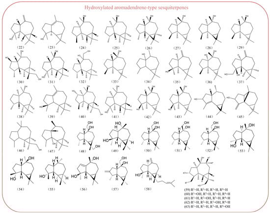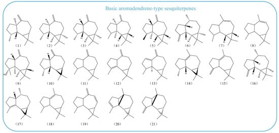 Most of the reported sesquiterpenes are derived from plant essential oils, with some derived from microbial fermentation products. A compound structure survey was carried out using the PubChem database. We searched chemicals by the basic aromadendrene-type structure and filtered the candidate compounds without literature information. Based on the varying degrees of modification in the skeletal structure, we classified and exhibited the aromadendrene-type sesquiterpenes into three categories: the basic and the hydroxylated aromadendrene-type sesquiterpenes and the meroterpenoids (Figure 2).