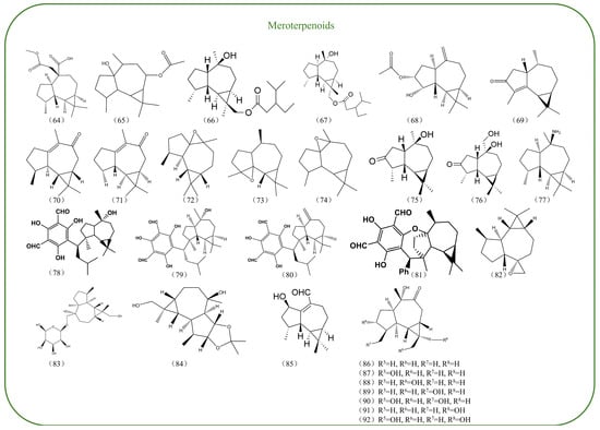 Volatile terpenoids function predominantly as inherent protective mechanisms that are released in substantial quantities from plants in response to attacks by pathogenic microorganisms or pests []. These compounds are mainly toxic to fungi, bacteria and viruses []. Further comprehensive research into volatile terpenoids may lead to the development of compounds that can protect crops against agricultural fungal infections or pests in the future. Two Eucalyptus plants (E. microtheca and E. viminalis) that are pharmacologically potent against diabetes, hepatotoxicity and inflammation contain various sesquiterpenoids, including compound (11) (12.773%), compound (38) (3.054 to 5.997%) and ledene (14) (5.665%) []. In addition, the petroleum ether fraction of its crude ethanol extract, mainly containing compound (38), exhibited effective inhibitory actions on Fusarium graminearum, Rhizobium graminearum and Botrytis cinerea. Furthermore, these plant essential oils could be an alternative source of natural insecticide agents to be used in medicinal and food products. Syzygiella rubricaulis is a kind of bryophyte that contains 50 compounds in its essential oil, with hydrocarbon sesquiterpenes (48.35%) and oxygenated sesquiterpenes (46.89%) being the predominant constituents []. The essential oil of this plant exhibited antibacterial, antioxidant and anticholinesterase activities Among these active effects, it showed a strong inhibitory effect on acetylcholinesterase (AChE), with an IC50 value of 26.75 ± 1.03 μg/mL, a moderate antibacterial effect (MIC 500 μg/mL) and antioxidant effects (ABTS: SC50 is 343.38, DPPH is 2650.23 μg/mL). These results suggested the potential therapeutic application of the bryophyte essential oil in treating Alzheimer’s disease due to its potent anticholinesterase properties. The chemical compositions of essential oils of Rhododendron tomentosum from eastern Lithuania at different stages were analyzed by GC-MS []. In total, up to 70 compounds were identified, among which palustrol (34) (24.6 to 33.5%) and compound (28) (18.0 to 29.0%) had the highest proportions. Moreover, the results of the antibacterial experiment on pathogenic yeast and the free radical scavenging activity experiment showed that the essential oil of this plant showed potential antibacterial and free radical scavenging abilities. Xanthomonas citri is a serious disease that affects the healthy growth of citrus plants worldwide, causing a disease referred to as citrus canker. The chemical composition and antibacterial activity of essential oils from the fresh and dried leaves of Schinus molle L were compared []. The subsequent analysis found that S. molle essential oil was rich in compound (35), which showed inhibition against X. citri. In another analysis the of the aromadendrene-type sesquiterpenoid aromadendrane-4,10-diol (41) isolated from the leaves of Xylopia brasiliensis, the compound exhibited inhibitory activity against the fungus Cladosporium cladosporioides []. These compounds can potentially inhibit this particular fungus’s growth, suggesting possible applications in drug development or agriculture. Compound (26), as the dominant compound in the essential oil of Lepidozia chordulifer, could inhibit bacterial growth and biofilm formation. Specifically, a 50 μg/mL concentration of compound (26) could inhibit 60% of Pseudomonas aeruginosa and 40% of Staphylococcus aureus []. The essential oil of Eriocephalus africanus L. in the Asteraceae family has compound (28) (19.92%) as one of the major components. This essential oil exhibited a certain inhibitory effect on tested pathogens, including Agrobacterium tumefaciens, Dickeya solani, Erwinia amylovora, Pseudomonas cichorii and Serratia plymuthica []. Among these, the antibacterial effect on D. solani was the most prominent. In the essential oils from three Ethiopian medicinal plants, Hagenia abyssinica (Rosaceae), Leonotis ocymifolia (Lamiaceae) and Moringa stenopetala (Moringaceae), compound (28) (58.57%) was the principal volatile oil component and showed trypanocidal activity [].