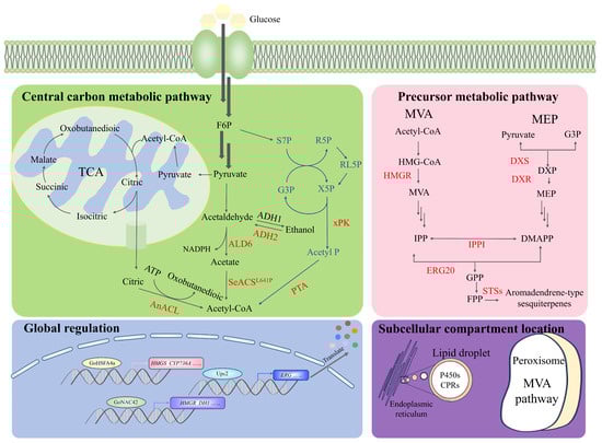 In order to increase the capability of producing sesquiterpenoids for hosts, a comprehensive strategy can be initially used to efficiently enhance metabolic flow (Figure 3). Firstly, rate-limiting enzymes in the precursor metabolic pathway of sesquiterpenoids need to be overexpressed or engineered (fusion, truncation and mutation) in the host cell. HMGR, IPPI and FPPS for the MVA metabolic pathway and DXS and IPPI for the MEP metabolic pathway should be preferentially considered. Moreover, the optimization of other steps in the MVA or MEP pathways might also be necessary to obtain higher sesquiterpenoid titers. In addition, screening key enzymes in the pathway from other organisms has been proven to be an advisable strategy to increase sesquiterpenoid titers [,]. Secondly, integrating alternative pathways to the precursor, such as the phosphoketolase pathway, or even reconstructing central metabolism, could potentially increase the supply of acetyl-CoA and the utilization rate of carbon sources, resulting in a significant efficiency for the synthetic production of sesquiterpenoids [,]. Thirdly, a global transcriptional influence on the metabolic pathways for sesquiterpenoid synthesis is crucial for optimizing gene expression, balancing metabolic flux, increasing terpenoid tolerance and inducing efflux, which can improve the production of target terpenoids [,,,]. In addition, subcellular compartments, such as the mitochondria, peroxisome and endoplasmic reticulum, have also been chosen as the location of sesquiterpenoid production pathways to facilitate magnificent yield improvements []. Cellular environments with unique properties should be considered for targeting a specific biosynthetic pathway. The compartmentalization strategy also enhances substrate concentration, contributing to the conversion by heterologous enzymes and reducing the toxicity effects of hydrophobic intermediates accumulating intracellularly.
