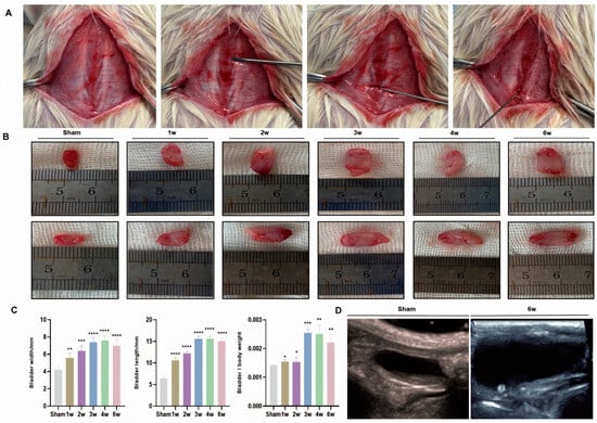 Surgical procedure for sacral spinal cord injury and subsequent bladder shape changes in the SSCI rat model. (A) The SSCI surgical procedure. From left to right, the sequence is as follows: The skin is dissected to locate the spinal process; the second image marks the first lumbar vertebra; the third image shows the L3-L4 intervertebral space; and finally, a small needle knife is inserted into this space to damage the spinal cord (fourth picture). (B) Comparison of bladder appearance in the sham group and 1 week, 2 weeks, 3 weeks, 4 weeks, and 6 weeks post-operation. (C) Weekly comparisons of bladder width, bladder length, and bladder/body weight (g/g). (D) Ultrasound comparison of the bladder in the sham group and the SSCI group at 6 weeks post-operation (* p < 0.05, ** p < 0.01, *** p < 0.001, **** p < 0.0001 compared to sham rats).