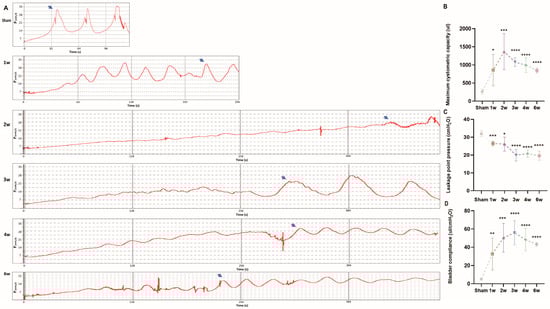 To evaluate the impact of the modeling method on the voiding function and weekly changes in micturition dynamics post-modeling, we conducted voiding and micturition dynamics experiments following the protocol outlined by Zheng et al. [26,27]. All six groups underwent successful surgery, with no postoperative fatalities. Urodynamic analysis revealed a rapid increase in maximum cystometric capacity (MCC) within 2 weeks post-modeling, rising from 262 µL ± 69.43 µL to 1361.67 µL ± 496.40 µL. However, MCC at 3, 4, and 6 weeks was lower than that at 2 weeks, gradually decreasing each week, yet remaining larger than the MCC at 6 weeks (842.50 µL ± 66.52 µL vs. sham group; Figure 2A,B, p < 0.0001).