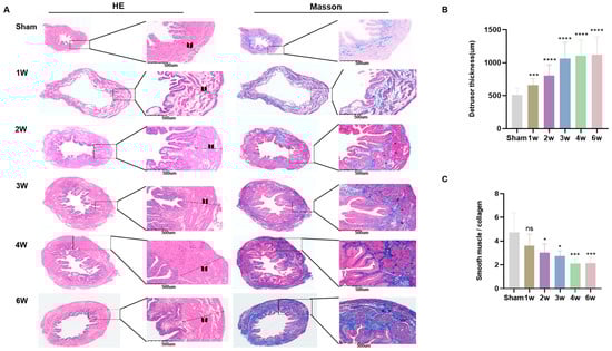 Postoperative pathological features of SSCI. (A) H&E staining and Masson staining were conducted in sham rats and SSCI rats. The black arrow denotes extensive fibrosis of the bladder wall, and “T” represents the thickness of the detrusor. (B) Weekly comparison of detrusor thickness; (C) Weekly comparison of the ratio of smooth muscle to collagen (ns = no significance, * p < 0.05, *** p < 0.001, **** p < 0.0001 compared to sham rats).