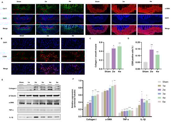 Based on the aforementioned findings, we can infer that bladder tissue hyperplasia and inflammatory response were notably active within the initial 2 weeks post-SSCI, gradually stabilizing thereafter, particularly by 3–4 weeks post-injury. Consequently, we selected bladder samples from 2 weeks and 4 weeks post-operation for immunofluorescence staining. Immunofluorescence analysis revealed that collagen I/a-SMA expression at 4 weeks post-operation was higher compared to both 2 weeks post-operation and the sham group (Figure 4A,C). CD68 staining indicated a higher macrophage positive rate at 2 weeks post-operation than at 4 weeks (Figure 4B,D). These results suggest an acute injury phase during the first 2 weeks post-operation, marked by increased macrophage reactivity and subsequent bladder tissue inflammation. Furthermore, we corroborated these findings through Western blot analysis (Figure 4E,F), which demonstrated a consistent trend with the immunofluorescence results.