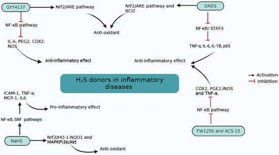 Mechanisms of action of H2S donors in inflammatory diseases. GYY4137 and DADS inhibit NF-κB pathways and activate the Nrf2/ARE pathway, which inhibits pro-inflammatory cytokines and activates antioxidant pathways, respectively. NaHS activates NF-κB and SRF pathways and activates pro-inflammatory mediators. NaHS also activates antioxidant pathways. FW1256 and ACS-15 also suppress the NF-κB pathway and show anti-inflammatory effects.