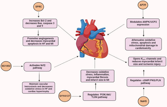 Role of H2S donors in CVD. SPRC promotes angiogenesis and decreases myocardial apoptosis in HF and MI. SG1002 maintains vascular hemostasis and decreases oxidative stress in HF and cardiac hypertrophy. GYY4137 decreases oxidative stress, inflammation, myocardial fibrosis, and infarct size in MI. NaHS opens up KATP channels and reduces myocardial infarct size and ischemic injury. AP39 attenuates oxidative stress, apoptosis, and mitochondrial damage in cardiotoxicity.