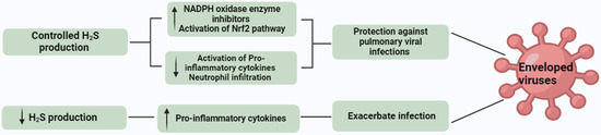 Role of H2S in viral infections. Controlled production of H2S provides protection against pulmonary viral infections. Decreased H2S production exacerbates infection.