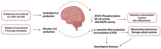 Role of H2S in neurological disorders. Controlled H2S production helps in the maintenance of mitochondrial function and provides anti-inflammatory effects, whereas increased H2S production results in mitochondrial dysfunction and damages cellular proteins.