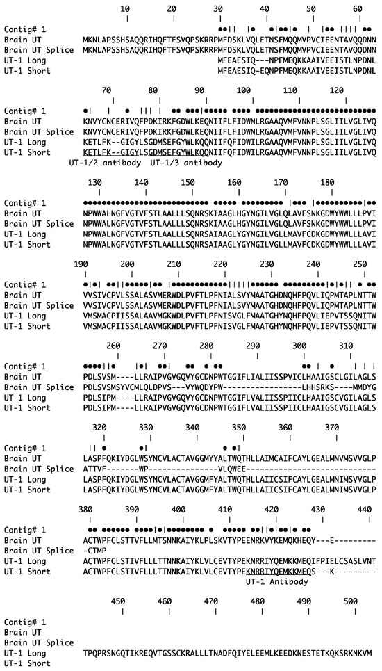 Amino acid alignment (single letter codes) of the complete sequences of Squalus acanthias Brain UT (Accession No. PQ050617) and its splice variant, Brain UT splice (Ac. No. PQ047459). Included for comparison are the UT-1 short (Accession No. AF257331 and HAGV01114644) and long (Accession No. HAGV01114645) sequences [5,11]. Dots above the alignment denote positions where the amino acids are the same. Vertical lines indicate where chemically similar amino acids are at that position. Underlining indicates the amino acid sequences used for peptide antigens for antibody production. There are between 4 and 8 amino acids in common between UT-1 and Brain UT in the antigenic regions.