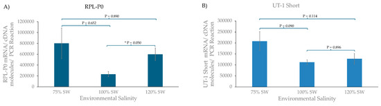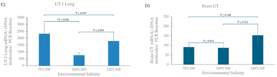 The quantitative PCR for the RPL-P0 control gene showed a significant difference between fish acclimated to 100% SW and 120% SW, although the 75% SW-acclimated group was also elevated compared to the animals in the normal SW (100%) group (see Figure 3). This suggests that the animals are significantly stressed by the osmotic environment, and that is causing upregulation in the protein synthesis machinery (RPL-P0 is a ribosomal protein). Similar trends were seen with UT-1 long and short, but only the difference between the 75% and 100% SW animals for UT-1 long was statistically significant. The Brain UT results were somewhat different, with only the 120% SW group elevated a lot compared to the 100% group, but this was not a statistically significant increase. The other interesting feature of the results was the approximate number of transcripts per PCR reaction. The levels for UT-1 short were around 100× greater than that for UT-1 long, which were again around 10× the level for Brain UT. This may explain why, in the original study of isolating the dogfish UT-1 cDNA, only UT-1 short was discovered [5].