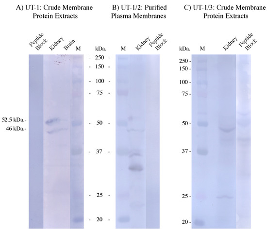 Western blots of Squalus acanthias protein crude extracts (400 μg; (A,C)) or purified plasma membranes (300 μg; (B)) from kidney and or brain tissue as indicated. Molecular Weight Protein marker (M) was Precision Plus Protein Kaleidoscope marker (Biorad, Santa Rosa, CA, USA). Peptide block refers to blots incubated with antibody pre-blocked (50 μg peptide/mL for >1 h) with the peptide antigen used to make the antibody. For the UT-1 antibody blot, the blot was one of four blot strips from one filter, with only one marker lane (M) which was located on a different strip, and so that was scanned separately and aligned with the UT-1 blot. All the peptide-blocked blot lanes were also cropped and slightly resized to align them next to each blot to aid comparison. Original scans are available on request.