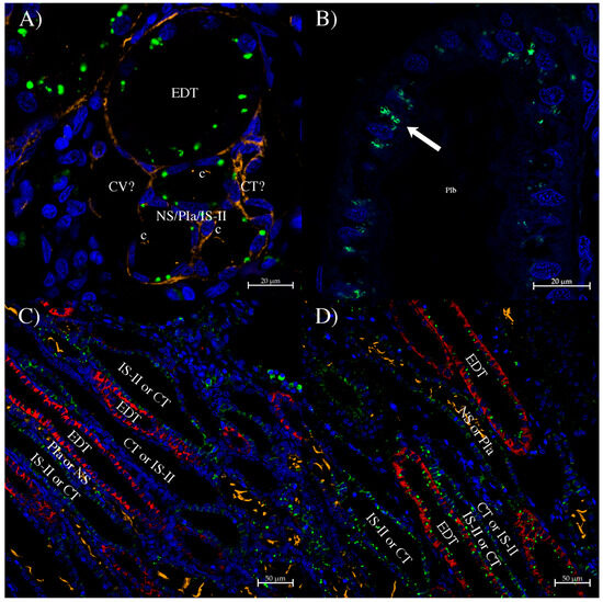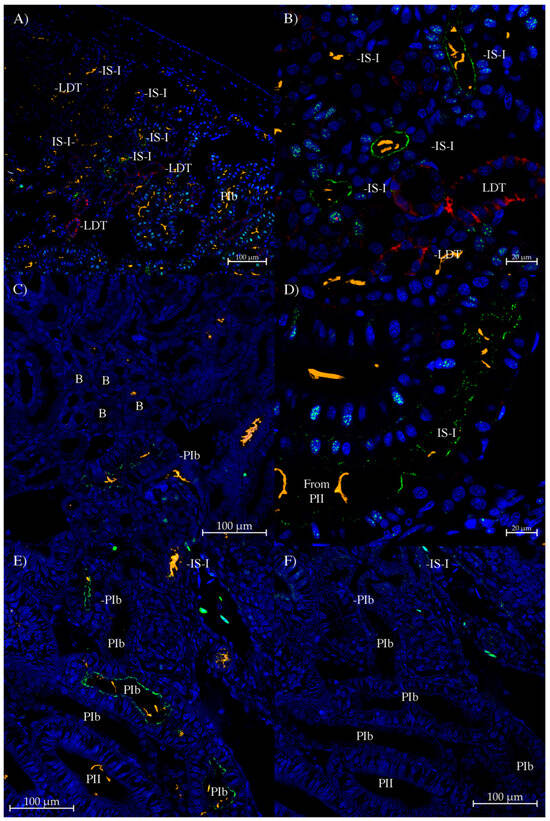 The UT-1 antibody (Figure 5 and Figure 6) showed mostly punctate staining in the cell cytoplasm with a small amount of staining occasionally at the apical pole of the cell (e.g., PII, Figure 6A), although that could be a matter of its lower intensity. The punctate staining was shown in high-resolution Aryscan images to be in membranous cytoplasmic structures (Figure 5B), generally on the apical side of the nucleus and so presumably located in the endoplasmic reticulum or Golgi. Staining was most intense in the sinus zone PIb tubule segment (Figure 6D), which can be observed in a tubule emerging from the straight bundle zone PIa segment (Figure 6C). Almost as strong staining was seen in IS-I tubules and the start (sLDT) and middle (mLDT) of the LDT loop (Figure 6A,C–E). The end of the LDT loop, where AQP3 staining was strongest (eLDT), showed no staining (Figure 6B). Occasional lower level staining was seen in the PII segment, probably in places where the tubule was transitioning from PIb to PII segments. In convoluted bundle zone cross-sections (Figure 5A), sparse dots of punctate staining were seen, although, overall, the level was generally very low. The EDT segment showed consistent staining, but of the other four tubule segments (in the bundle), usually two, occasionally three, showed staining, and on one occasion, possibly all four other (non-EDT) tubule segments had punctate dots of staining (Figure 5A). Which of these tubules is which (neck segment [NS], proximal 1a [PIa], intermediate segment II [IS-II], collecting tubule [CT], or even the non-nephron central vessel, CV)), is hard to identify. Despite that, it is clear that the CT segment did not express much UT-1 protein, and it is possible that there was none, and there was no sign of membrane staining at all. In the straight bundle zone, there was patchy staining, with some punctate staining in some parts of the EDT (identified with AQP4/2 antibody; red). There was sometimes lower-level staining in more proximal tubule segments (which have cilia in them, i.e., NS or PIa; tubulin-staining orange). There were two other tubules, one unstained and one with both general cytoplasmic staining and punctate staining, which were distal tubules (due to lack of cilia) either IS-II or the CT.