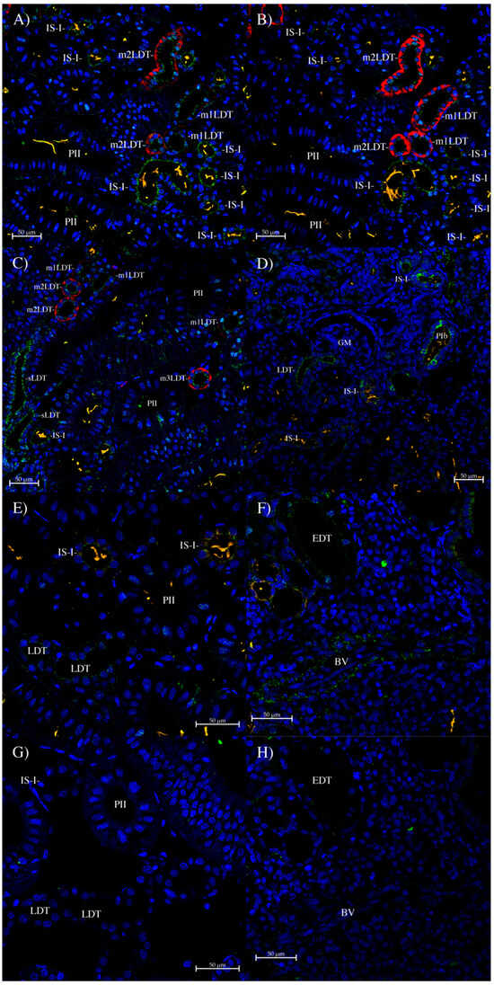 Elasmobranchs have a complicated renal nephron structure. This study of nephron segment terminology uses that of Cutler et al. [12], which is an amalgam of those of Hentschel et al. and Kakumura et al. [13,14], where the kidney has two zones, the sinus zone, where the nephron has two loops surrounded by blood sinuses, and the bundle zones with another 2 loops as well as the collecting tubule, all surrounded by a peritubular sheath [15]. After the glomerulus, the nephron segments are the neck segment (NS) and proximal Ia (PIa; first bundle zone loop), the proximal Ib (PIb), proximal II (PII), intermediate segment I (IS-I; all parts of the first sinus zone loop), intermediate segment II (IS-II), and early distal tubule (EDT; both second bundle zone loop); then the late distal tubule (LDT; second sinus zone loop); and the collecting tubule (CT; bundle zone) and collecting duct (CD; see [12] for model diagram). Additionally, the tubules in the bundle zone have a straight portion starting in the center of the sinus zone and extending across the kidney towards the lateral sides, followed by a convoluted lateral bundle zone, where the tubules run in a posterior–anterior direction with loop segments returning in the opposite direction. This is such that when the transverse kidney sections are seen, the straight bundle zone tubules are longitudinal, whereas the lateral convoluted bundle zone tubules are seen generally in cross-section, with classically, five tubule cross-sections in a ‘bundle’, namely, NS, PIa, IS-II, EDT, and CT, the EDT being recognizable by its larger sized diameter. Also, as discussed in Cutler et al. [12], cilia are present in abundance in the proximal half of the nephron (up to IS-II) but are absent from the LDT [16,17,18]. This difference was, therefore, used to distinguish between the similar sinus zone IS-I and LDT tubules using an anti-acetylated tubulin antibody, which stains cilia [12].