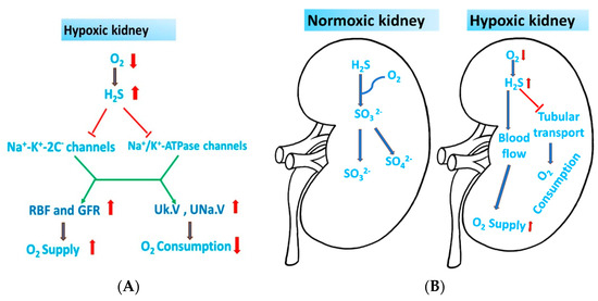 In summary, H2S promotes vasodilation and inhibits the activities of Na+/K+-ATPase (NKA) and the Na+-K+-Cl−-cotransporter (NKCC), which in turn raises renal blood flow (RBF) and GFR and encourages natriuresis (UNa.V) and kaliuresis (Uk.V) [36] (Figure 3A). However, it is still unclear how H2S affects the kidney’s ionic exchanger ability.