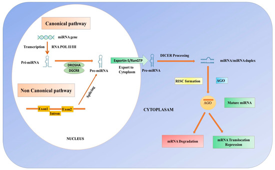 MicroRNAs, also known as non-coding single-stranded endogenous miRNAs, have between 19 and 23 nucleotides in length and are involved in post-transcriptional gene silencing in all eukaryotes [158,159,160,161,162,163]. Ambros’s group in 1993 first discovered miRNA in Caenorhabditis elegans and showed surprisingly high conservation across species [158,162,163,164]. The biogenesis of miRNAs starts in the nucleus, where the miRNA gene is transcribed by RNA polymerase II, to produce a long primary miRNA [165,166,167] (Figure 5).